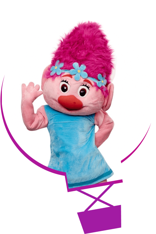 When you’re planning a Trolls themed kids birthday party who better to put in an appearance than the queen of the Trolls herself, Poppy Troll. Our Poppy Troll Party entertainment is perfect for preschoolers and young children or you can hire her for a mascot visit only. She’s a real wow whichever you decide is best for your kid’s Trolls themed party. Our Poppy Troll entertainer is a super cute, but larger than life, version of the film character and will add a definite splash of colour to any kid’s birthday celebration.